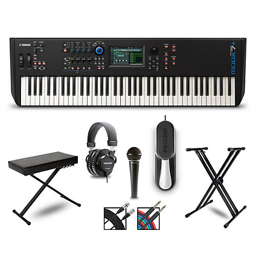 Bundle includes the MODX7+ synthesizer, double-braced keyboard stand, padded bench, sustain pedal, headphones, dynamic microphone and cables76-note semi-weighted keybed perfect for keyboardistsMotion Control Synthesis unifies and controls AWM2 and FM-X sound engines256 notes total polyphony (128 AWM2 + 128 FM-X)1.75GB internal Flash memorySuper Knob controls multiple parameters simultaneouslySend 10 and receive four audio channels, plus 16 channels of MIDI, via a single USB cableLive Sets allow Performance organization without copying, changing order or renamingFour-part seamless sound switching—change Performances while holding notes without sound or effect cutoffMotion Sequences drive synthesizer parameters through rhythmic control data you can interact with in real time